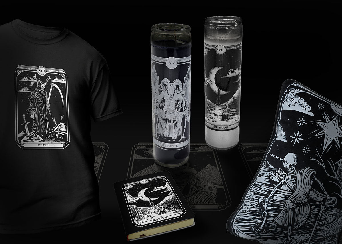 Explore our Tarot Collection, featuring original Noir Star designs on a variety of products like shirts, bags, candles, and more.