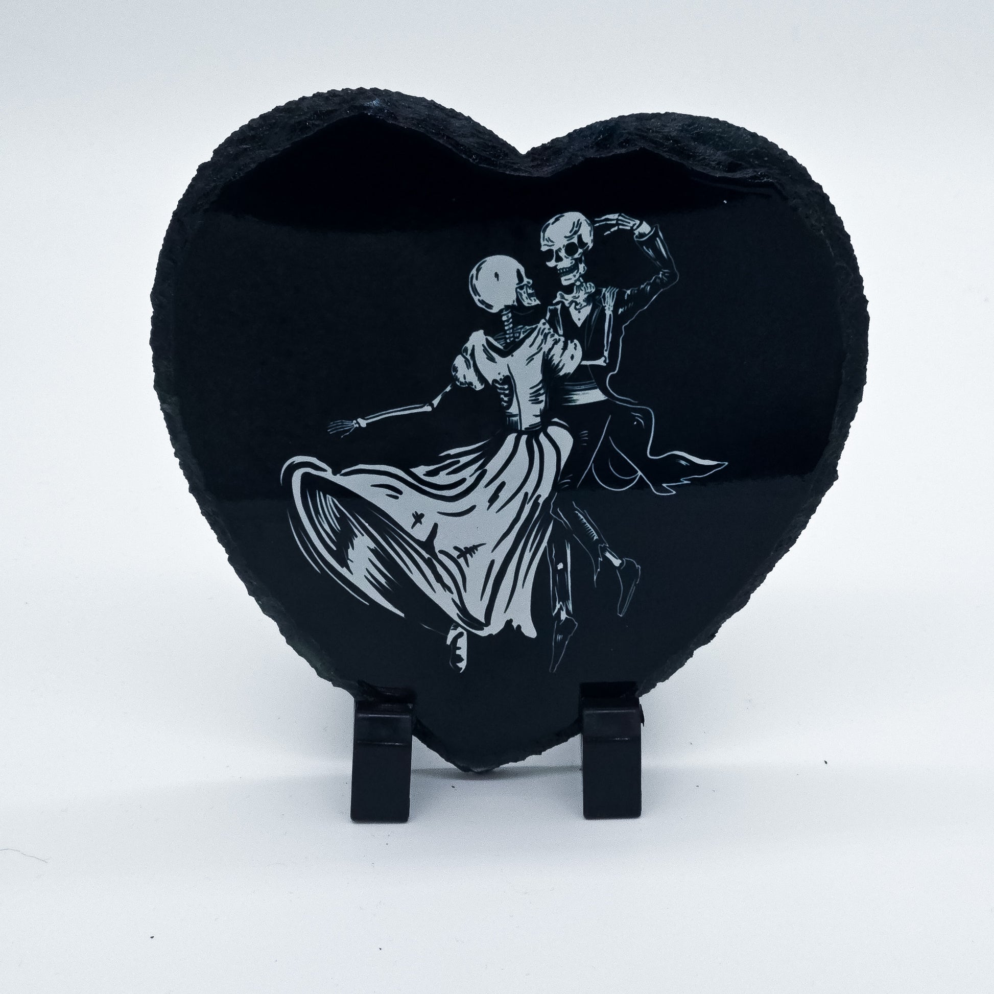 A hauntingly romantic heart-shaped stone slate, two skeletons dancing
