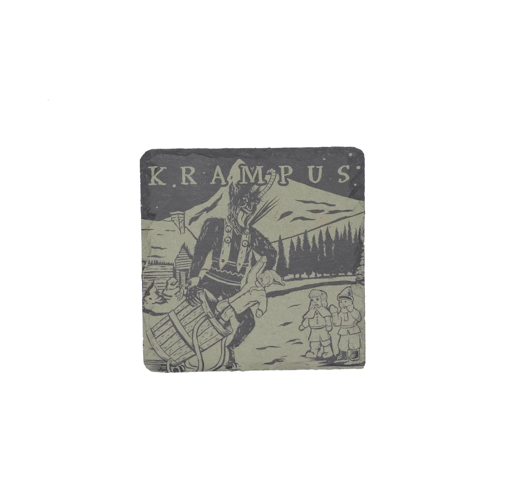 Laser engraved stone coaster with Krampus original artwork.
