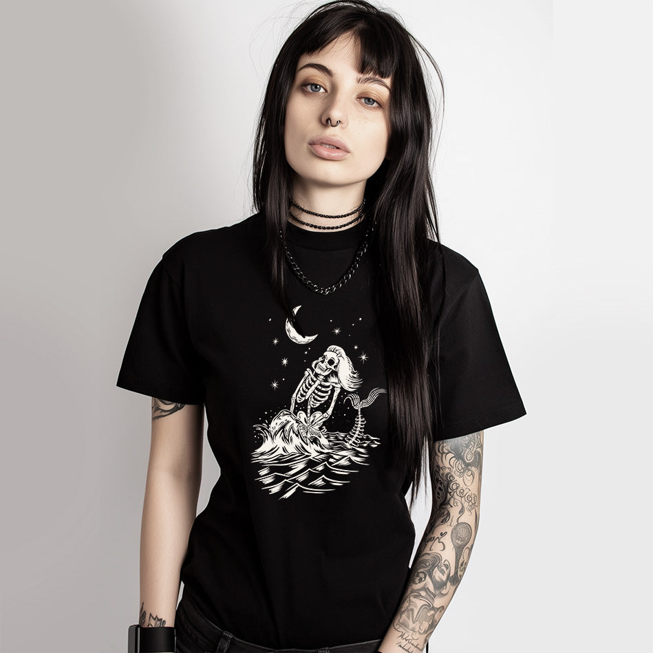 Mermaid Skeleton is how it sounds. Printed on a soft, lightweight, and durable quality of our classic short-sleeve tee, crafted from 100% ring-spun cotton.