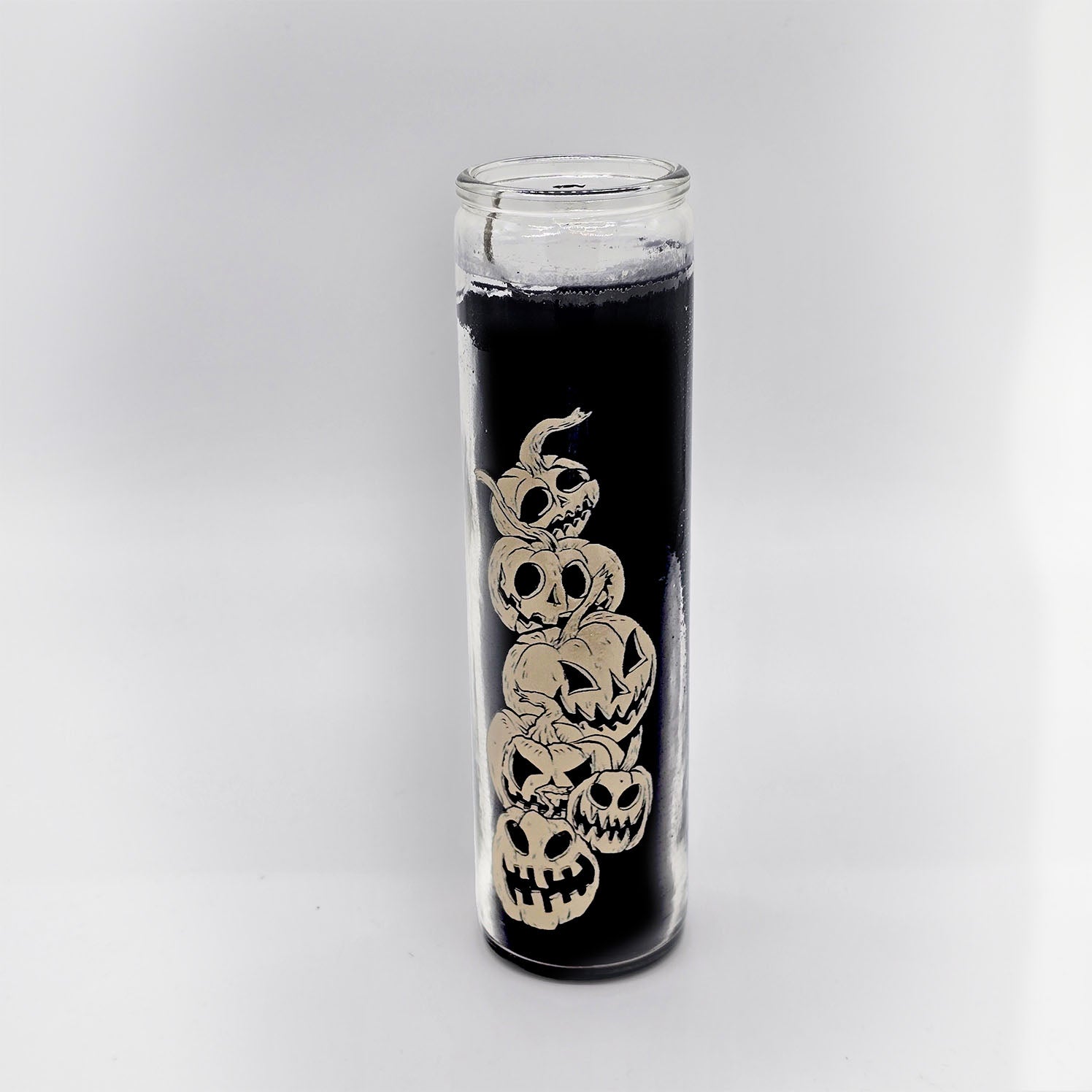 Tall glass paraffin wax candle.